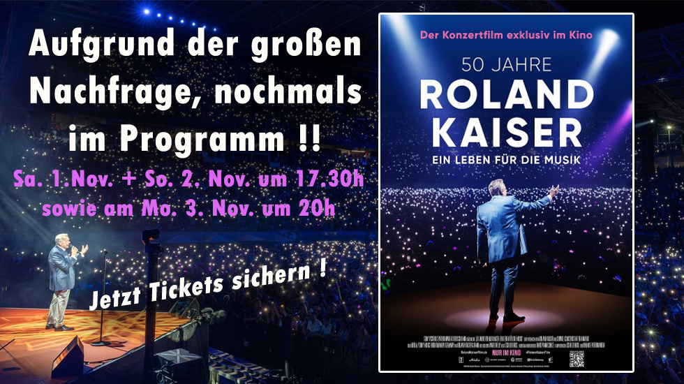 Zum ersten Mal im Kino und schon jetzt im Vorverkauf - bei uns auf der großen Leinwand im Kinosaal 1: Roland Kaiser wurde Im Rahmen seiner ausverkauften "RK50 I 50 Jahre – 50 Hits!"-Tournee im vergangenen Jahr filmisch begleitet. Freut Euch auf eine spektakuläre Show! Sichert euch jetzt die Tickets.