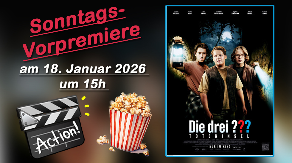 Bereits 5 Tage vor offiziellem Bundesstart zeigen wir in der Sonntags-Vorpremiere am 15. Oktober 2023 um 15h "Die drei ??? – Toteninsel". Damit bringt ein neuer Fall die Jungs Justus, Peter und Bob zurück auf die Leinwand. Große und kleine Fans dürfen sich auf ein neues Leinwand-Abenteuer der erfolgreichen Reihe freuen. Sichert euch jetzt die Tickes! Vorverkauf läuft!