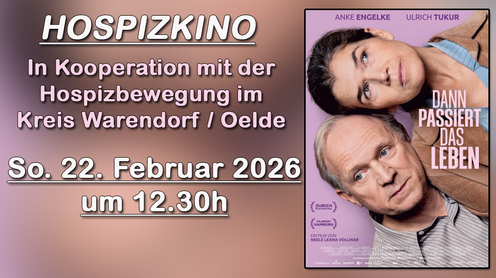 Ein absolut berührendes Kinoerlebnis am 22. Februar 2026 um 12:30 Uhr! „Dann passiert das Leben“ beleuchtet sehr tiefgehend die Herausforderungen des Ehepaars Rita und Hans nach Hans Pensionierung. Auf einmal ist nicht mehr klar, ob sie zwei Einzelne oder ein Paar sind. Doch dann passiert das Leben... Seid Teil dieser besonderen Vorführung in Kooperation mit der Hospizbewegung im Kreis Warendorf / Hospizgruppe Oelde