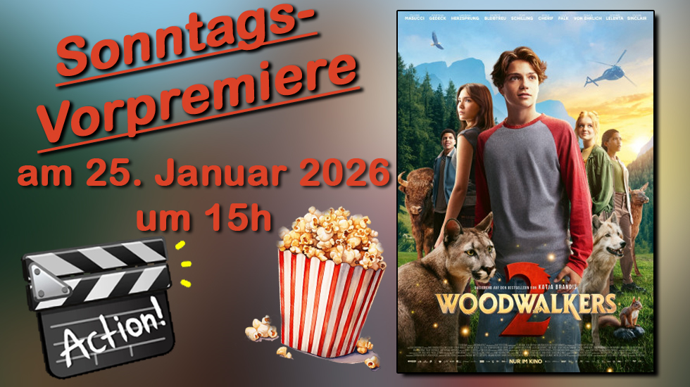 Woodwalkers Fans aufgepasst…! Bereits 5 Tage vor offiziellem Bundesstart zeigen wir in der Sonntags-Vorpremiere am 25. Januar 2025 um 15h Woodwalkers 2. Für Carag, Brandon, Holly und Lou beginnt ein neues Schuljahr. Und das hat es in sich, denn das Naturschutzgebiet rund um die Schule ist in Gefahr. Carags Mentor plant, den Wald und das Revier der Gestaltwandler zu verkaufen! Carag und seine Freunde versuchen dies mit allen Mitteln zu verhindern, doch Milling hat einen Spion an der Schule... Sichert euch jetzt die Tickes!
